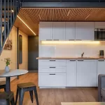 Experimenta el máximo confort en la cocina del apartamento Queen Barbora Central Lofts, equipada con un hervidor eléctrico, nevera y menaje de cocina. La parada de autobús Studentu skveras está cerca de este alojamiento.